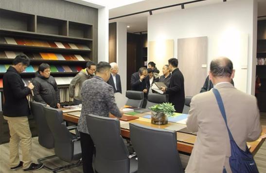 在選樣室中,沈總向考察團(tuán)一行介紹了康輝全屋定制所選用的新型環(huán)保板材和推出的各大色系產(chǎn)品,雙方就木材環(huán)保性能和當(dāng)下的時(shí)尚流行色彩進(jìn)行了交流和探討,雙方都獲益匪淺。