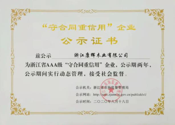 康輝地板通過浙江省守合同重信用企業(yè)3A認(rèn)證