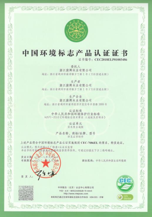 2018年9月5日,康輝地板、木門在經(jīng)過國家高規(guī)格的認(rèn)證委員會檢測評定,正式通過中國環(huán)境標(biāo)志認(rèn)證審核,由中華人民共和國環(huán)境保護(hù)部授權(quán)頒發(fā)了中國環(huán)境標(biāo)志產(chǎn)品認(rèn)證證書(十環(huán)認(rèn)證)。