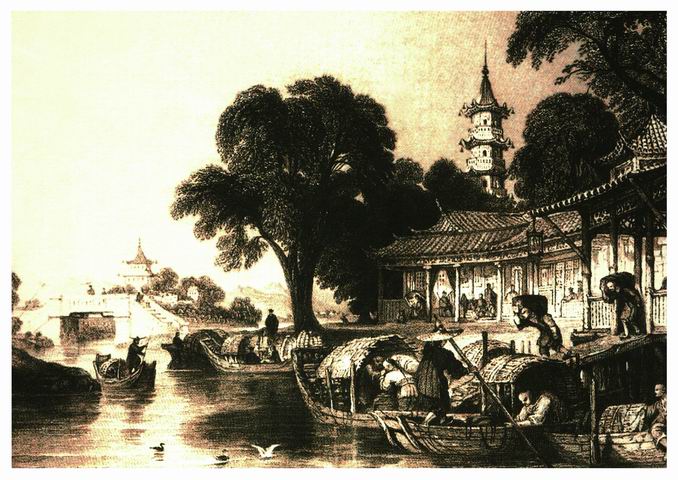 19世紀(jì)末英國人托烏斯·阿羅姆的版畫,真實描繪了當(dāng)時的水鄉(xiāng)南潯的鎮(zhèn)貌,擁擠的潯溪船流如織,源源不斷的將絲綢途徑上海運往世界各地,當(dāng)時師從木藝多年沈氏高祖也開始在匠人界嶄露頭角。
