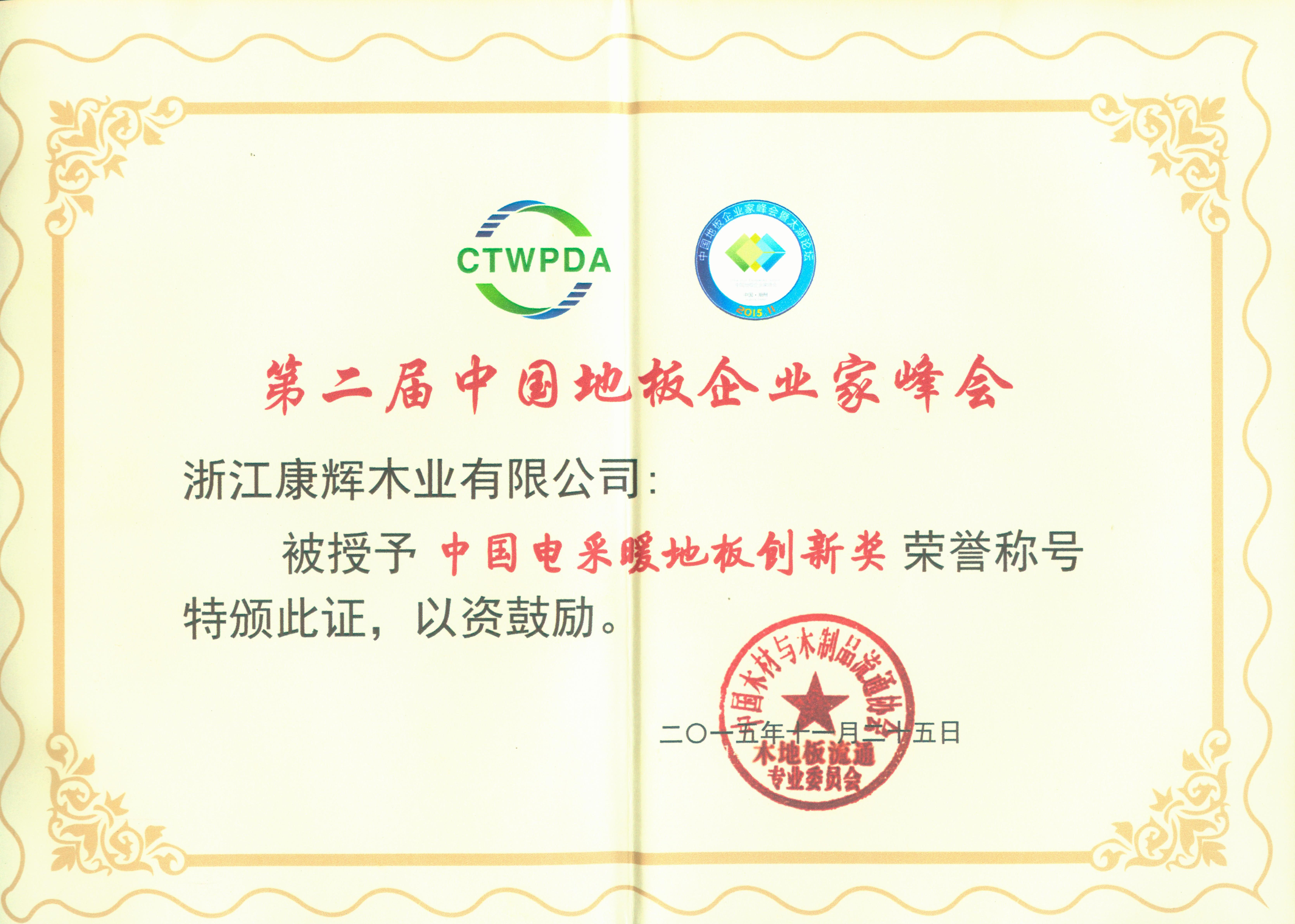 2015年11月25日,浙江康輝木業(yè)有限公司董事長沈建康出席了在湖州東吳開元名都酒店召開的第二屆中國地板企業(yè)家峰會暨南太湖論壇,并在此重大會議上喜獲中國電采暖地板科技創(chuàng)新獎。